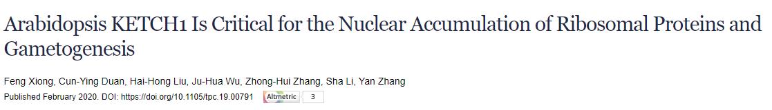 2020年2月21日,山东农业大学生命科学学院张彦/李厦团队在The Plant Cell 发表了题为Arabidopsis KETCH1 is critical for the nuclear accumulation of ribosomal proteins and gametogenesis 的研究论文。该研究揭示了核输入蛋白KETCH1 (karyopherin enabling the transport of the cytoplasmic HYL1) 通过促进核糖体蛋白的核积累,从而调控雌雄配子体发育的分子机制。