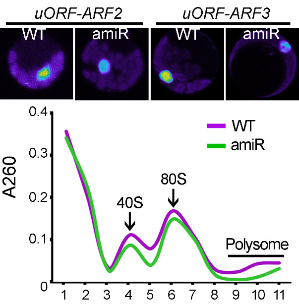 图:Translation of genes with uORF is sensitive to a reduction of mature ribosomes in KETCH1-downregulating plants.