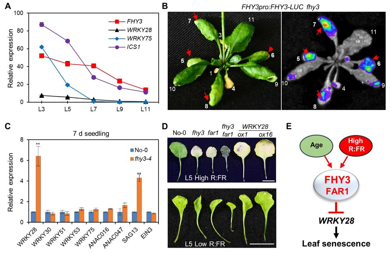 fhy3突变体及WRKY28-ox株系在高比率R/FR光照条件下表现明显的提前衰老的表型,说明FHY3-WRKY28介导了高比率R/FR光照条件对叶片衰老的抑制作用。进一步分析发现,FHY3及WRKY28均受年龄因素调控,说明FHY3-WRKY28整合了年龄因素及光信号进而调控叶片衰老过程。