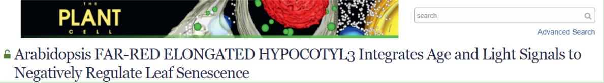 2020年3月9日,山东农业大学生命科学学院李刚教授课题组在The Plant Cell在线发表了一篇题为Arabidopsis FAR-RED ELONGATED HYPOCOTYL3 Integrates Age and Light Signals to Negatively Regulate Leaf Senescence 的研究论文,在模式植物拟南芥中揭示了光信号蛋白FHY3和下游转录因子WRKY28通过整合年龄及光信号途径调控叶片衰老的分子机理。