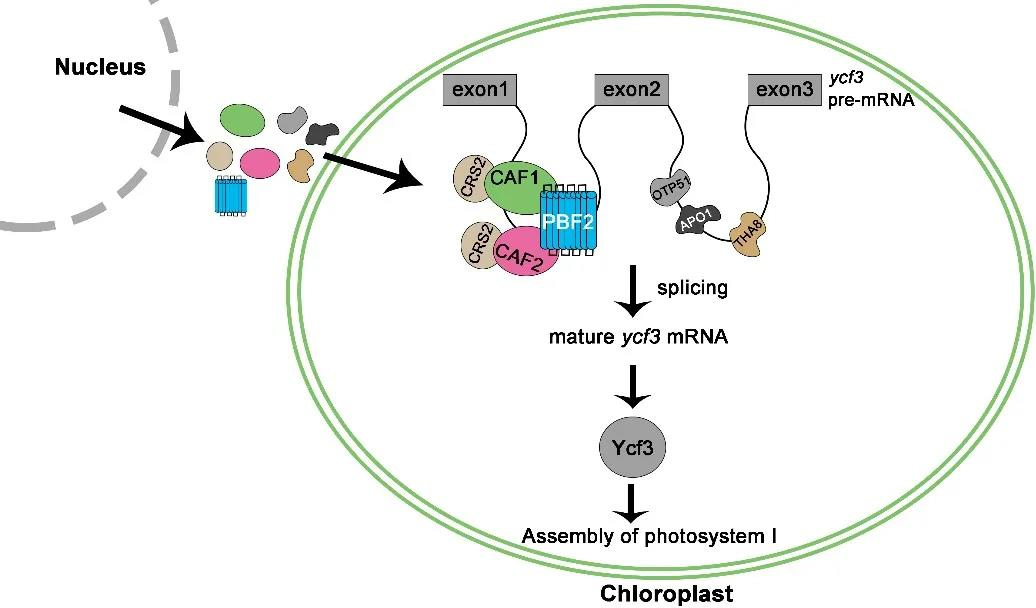 卢从明课题组通过波谱学手段筛选并获得了一个影响PSI生物发生的突变体pbf2(Arabidopsis thaliana photosystem I biogenesis factor 2)。pbf2突变体表现出一个白化致死的表型,其PSI复合体和PSI活性完全缺失。PBF2编码一个P亚家族的PPR蛋白,由9个PPR基序组成,定位于叶绿体类核区,表明PBF2可能参与叶绿体基因的表达调控。进一步研究发现,PBF2通过参与ycf3内含子1的剪接而特异的调节ycf3的表达。生物信息学和生化实验证明PBF2能够与ycf3内含子1的一段序列结合。研究还发现PBF2与两个已知的剪接复合体关键因子CAF1和CAF2相互作用并促进了二者与ycf3 内含子 1的结合。由于Ycf3是一个参与PSI复合物组装的关键因子,该研究工作揭示了PBF2与CAF1和CAF2协作调节ycf3 内含子1剪接的机制以及叶绿体基因表达与PSI生物发生的关系。卢从明课题组近年来在PSI生物发生机制研究中取得了一系列进展,发现了一些参与PSI生物发生的关键调节因子(Wang et al., Mol Plant, 2017;Yang et al., Plant J, 2017;Yang et al., Biochim Biophys Acta, 2015;Liu et al., Plant Cell, 2012)。这篇论文揭示了叶绿体基因表达与PSI生物发生之间的密切联系。中国科学院植物研究所博士生王雪梅和杨志攀博士为该论文的第一作者,山东农业大学卢从明教授为通讯作者。另外,山东农业大学的张毅副教授和张爱红副教授以及中国科学院植物研究所博士生周稳也参与了该项研究工作。该研究得到了国家自然科学基金和中国科学院前沿科学重点研究项目的资助。
