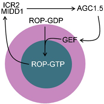 作为正反馈调控元件,AGC1.5不仅调控ROP信号,还应该受到ROP信号的调控。研究人员通过酵母双杂交筛选AGC的互作蛋白。从中发现ROP的两个效应蛋白ICR2/RIP3及MIDD1/RIP4。这两个效应蛋白均带有两个coiled-coil结构域。研究人员证明AGC1.5激酶与ICR2/MIDD1以及ROP三者形成复合体,且三者结合形式依赖于GTP结合形式的ROP以及具有激酶活性的AGC1.5。进一步研究表明ICR2及MIDD1作为ROP的效应蛋白,不仅将AGC激酶招募到质膜上活性ROP的区域,还促进AGC对于RopGEF的磷酸化,保证RopGEF在根毛生长过程中的顶端定位,从而维持根毛生长过程中ROP信号的极性动态分布。