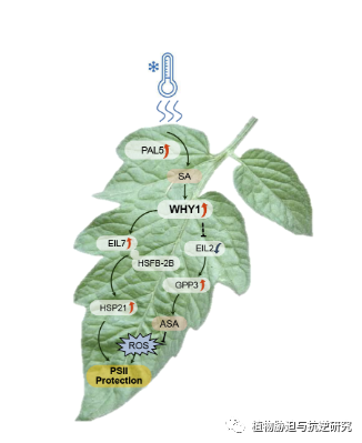 此外,SlWHY1间接抑制SlEIL2的表达,使L-半乳糖-1-磷酸磷酸酶3(SlGPP3)得以表达。随后较高的SlGPP3丰度促进了抗坏血酸的积累,从而清除了低温胁迫下产生的活性氧(ROS),从而保护了PSII。