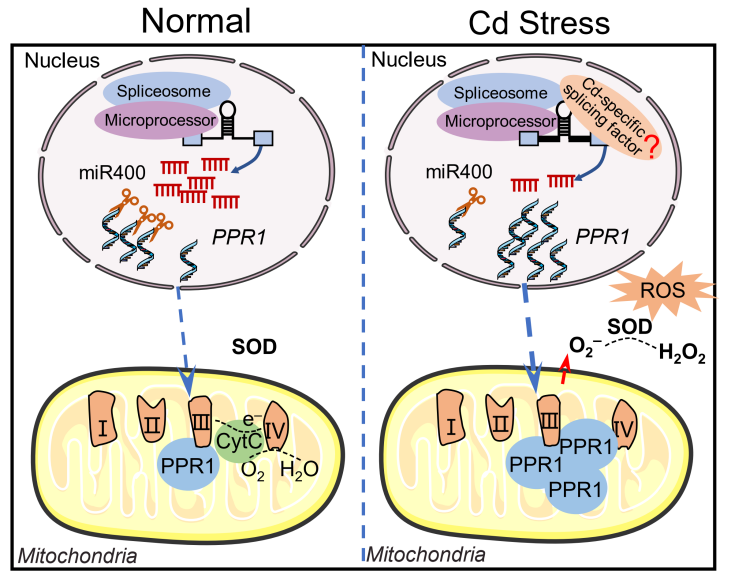 为详细研究内含子miRNA的加工剪切过程,课题组构建并创制了能够观察内含子miR400剪切的含荧光素酶报告基因的遗传材料。通过大范围的筛选发现,重金属镉离子处理会特异诱导miR400的内含子发生保留,成熟miR400的产生受到抑制。过表达miR400降低了拟南芥镉胁迫抗性,敲低miR400表达增强了拟南芥镉胁迫抗性。进一步研究发现,这种剪切抑制miRNA的产生进一步解放了miR400的靶基因PPR1。PPR1定位于线粒体,直接影响电子传递链中的线粒体复合体III(Complex III)活性和线粒体编码基因ccmB的RNA编辑,能够通过维持较低的ROS水平来增强拟南芥镉胁迫抗性。