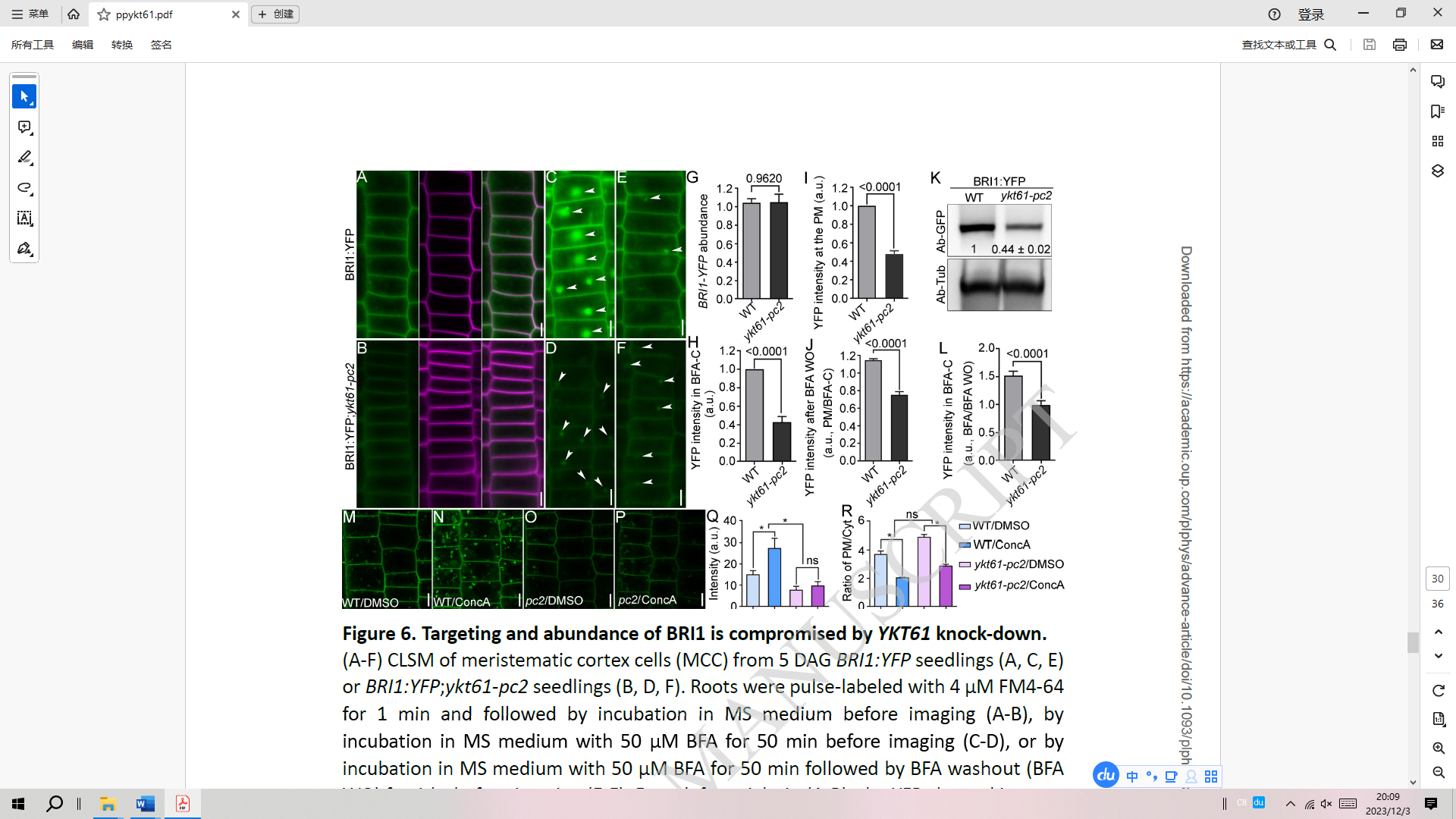 拟南芥YKT61是一种非典型的R-SNARE蛋白,不包含其他R-SNAREs所具有的跨膜(TM)结构域,因此它主要存在于细胞质。该团队之前研究发现,YKT61的功能缺失导致雌/雄配子体致死(Ma et al., 2021)。本研究通过利用YKT61的弱突变材料-ykt61部分回补(ykt61-pc)株系,发现敲降YKT61导致因细胞分裂减少而造成的RAM长度变短,这与bri1-116突变体类似。YKT61与BRI1互作,对于BRI1靶向质膜的动态再循环至关重要。进一步分析表明,YKT61对液泡的动态生物发生、高尔基体形态的维持和内吞作用均十分重要,这也暗示它可能是一个植物整体生长和发育必须的基因。