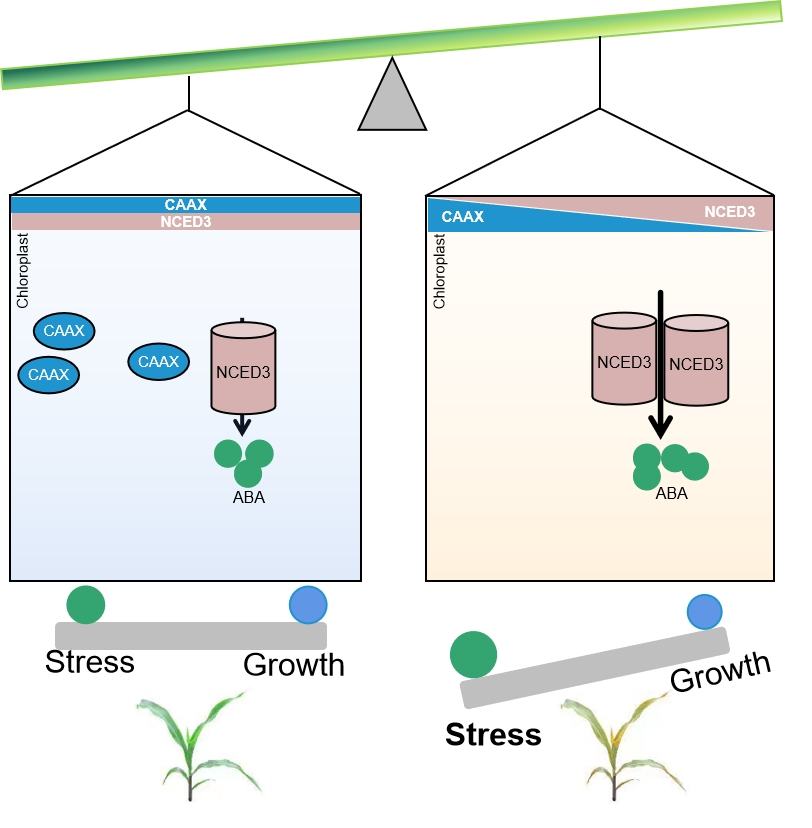 研究团队首先通过精细定位和RNA-seq技术确定了ZmCAAX是叶黄突变体yp1的候选基因。 转录组结果显示ZmCAAX突变影响了类胡萝卜素的降解和ABA的生物合成。进一步研究发现ZmCAAX与ABA合成酶ZmNCED3相互作用调并影响其蛋白稳定性,本研究在玉米中首次鉴定到了ZmNCED3的上游调控因子,并解析了ZmCAAX参与调控ZmNCED3降解的分子机制。对叶绿体蛋白降解与环境胁迫之间的关系提供了理论基础。通过基因编辑ZmCAAX基因或选择ZmCAAX的自然变异等位基因,可以显著提高植物的抗旱能力和总类胡萝卜素含量。为玉米在干旱胁迫下实现资源优化分配提供了新思路。通过靶向调控ZmCAAX的表达,有望在籽粒营养品质提升与抗旱育种之间实现精准平衡,助力培育兼具高产、耐旱与营养品质优良的玉米新品种。