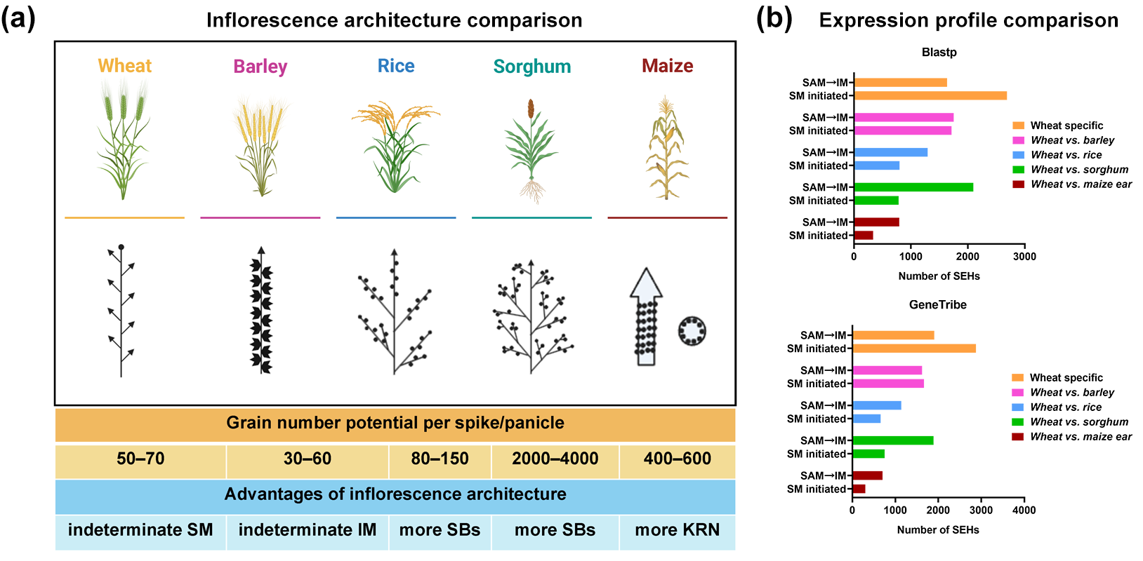 穗粒数是禾本科作物的重要产量性状,而花序构型直接决定了穗粒数的形成,在漫长的作物育种过程中对作物花序构型的改良直接推动了作物产量的提升。在长期的自然演化和人类驯化的共同作用下,不同禾本科作物均发生了相对紧凑的穗型选择,某种程度上形成了求同存异的花序构型/穗型,而不同物种花序构型间的差异在一定程度上造成了小麦、水稻、玉米、高粱等主要作物穗粒数的显著差异。