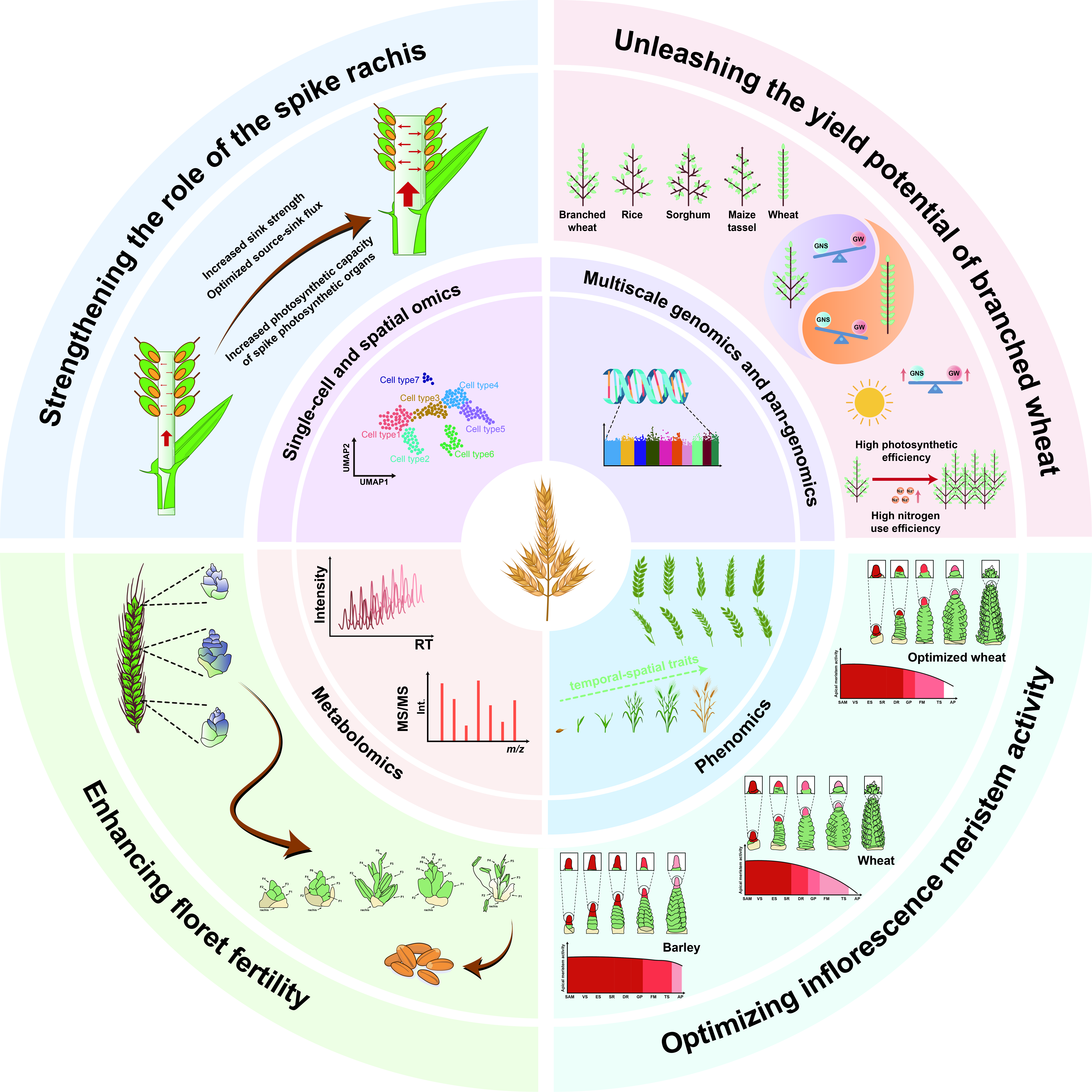 如何从花序构型的角度解锁小麦增产的密码?文章提出需要从包括解锁分枝小麦的产量潜力、花序顶端分生组织活性的维持、提高小麦小花的育性以及增强小麦穗轴对营养物质的利用效率这四个主要方面出发,从基因组学、代谢组学、单细胞组学和表型组学等不同组学角度,开展不同禾本科作物花序发育和构型差异的多维度比较分析,利用基因工程、深度学习和人工智能手段,重新设计能够最大限度释放小麦穗粒数潜力的花序构型,突破小麦单产提升的瓶颈,进一步提高小麦产量,保障我国粮食安全。
