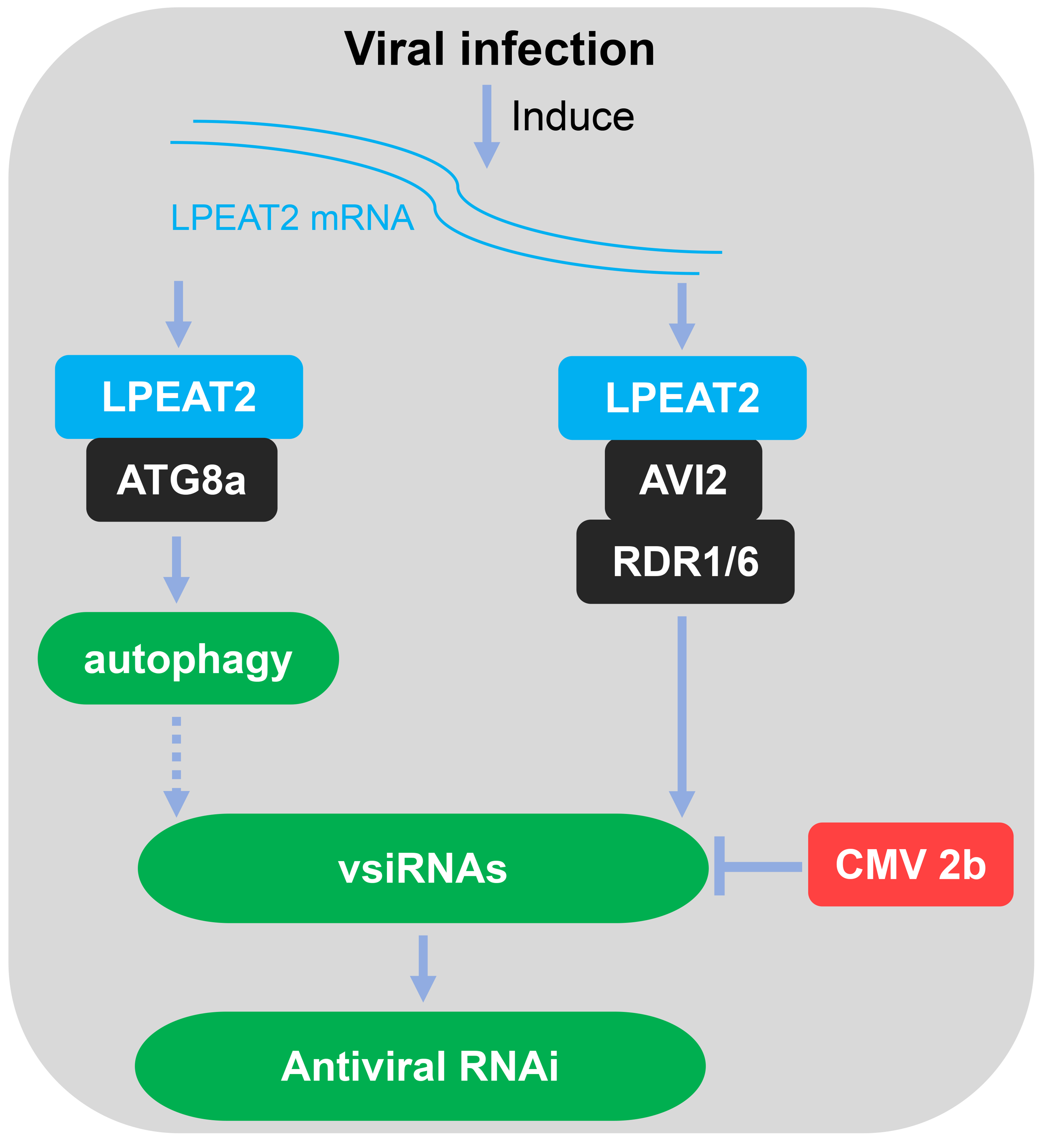 图1. LPEAT2协同AVI2及ATG8a调控小RNA介导的植物抗病毒RNAi。