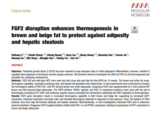 山东农业大学林海和李海芳课题组揭示FGF2对脂肪组织产热的调控作用