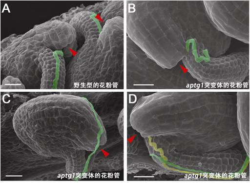 进化过程中,植物的精子细胞失去了长距离运动的能力。依赖花粉管的生长,植物的雄配子(精子)到达胚囊的雌配子(卵细胞)和中央细胞附近,以完成双受精作用,启动胚和胚乳的发育。在柱头上萌发的花粉产生花粉管,能导向珠孔生长进入胚珠,是花粉管能够将精子运送到胚囊中的前提。 生科院张宪省教授研究组发现拟南芥编码甘露糖基转移酶的基因APTG1(斜体)突变后,花粉管就不能正常生长到达珠孔部位,造成受精失败。APT