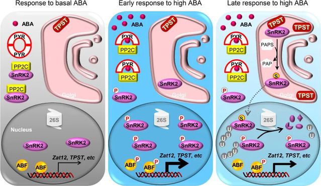 脱落酸(abscisic acid, ABA)是一种重要的植物激素,与植物的环境适应性、生长发育及种子休眠等众多生物学过程密切相关。在干旱、高温等逆境条件下,植株体内ABA含量显著升高、ABA信号转导通路被快速激活,进而增强植物的逆境抗性。但激活的ABA信号亦严重抑制植物的生长发育,因此,ABA信号转导需要灵活的“刹车/脱敏”机制,以平衡抗性与生长之间的关系。目前,ABA信号的“刹车/脱敏”机制尚不清楚。JIPB近日在线发表了山东农业大学黄金光/郑成超课题组题为“Tyrosylprotein Sulfotransferase suppresses ABA Signaling via Sulfation of SnRK2.2/2.3/2.6”的研究论文。酪氨酸磺基转移酶(Tyrosylprotein sulfotransferase, TPST)催化底物蛋白...