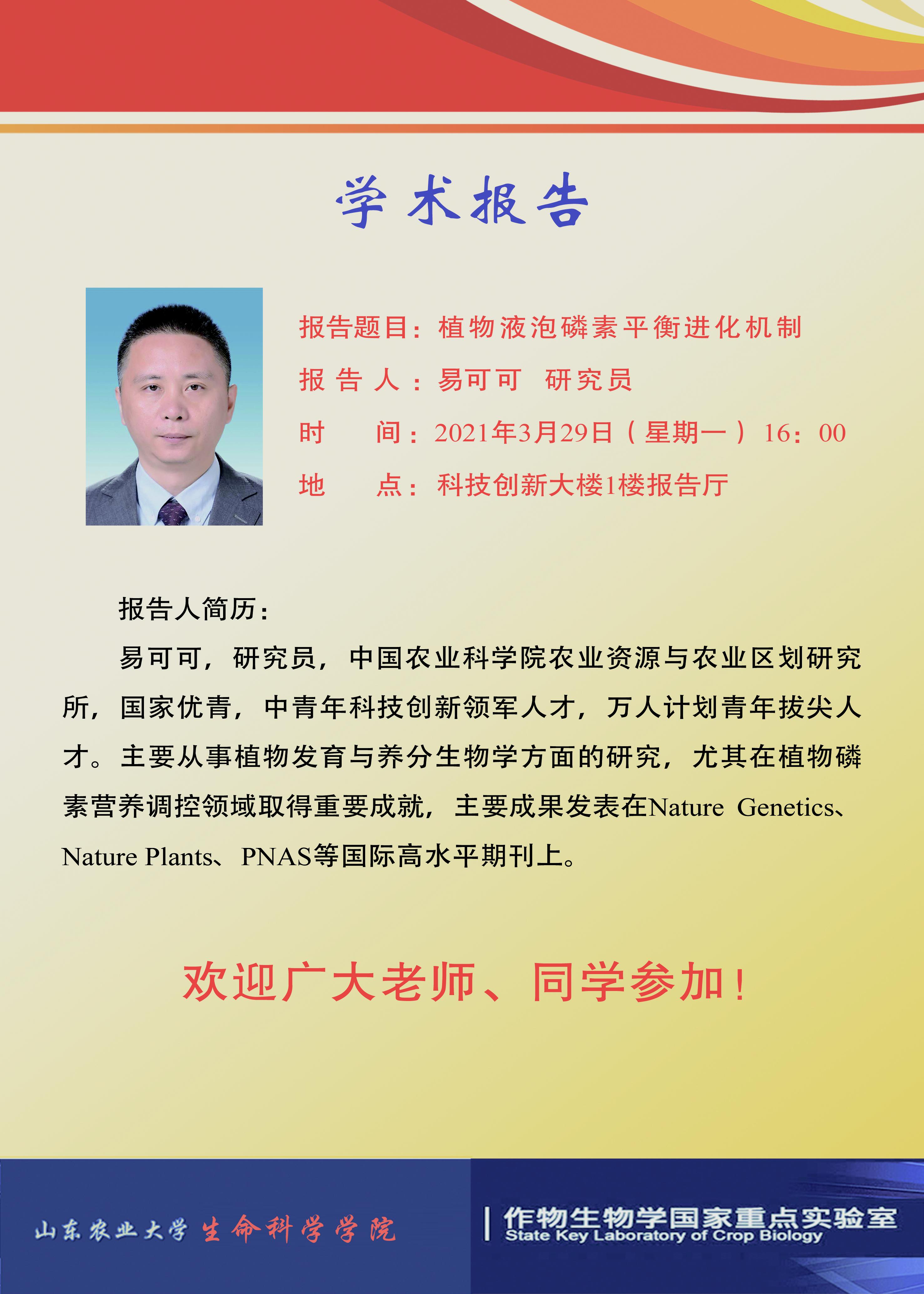 报告人:詹帅 研究员时间:6月23日16:30地点:国家重点实验室一楼学术报告厅报告人简介:詹帅,男,中科院上海植物生理生态研究所研究员,博士生导师、海外高层次人才计划青年项目、国家自然科学基金委优秀青年基金获得者。2005年本科毕业于南京大学,2010年博士毕业于中科院上海生科院,获动物学博士学位。2010-2014年在美国马萨诸塞大学进行博士后研究,2014年3月起,任中科院上海植物生理生态所研究员。主要从事昆虫适应性研究:利用遗传学、基因组学和生物信息等手段学,系统研究昆虫在适应环境过程中复杂行为和复杂性状的形成机制和演化模式。先后主持国家自然科学基金优青、面上项目和国家重点研发计划课题等。主要研究成果以第一作者或通...
