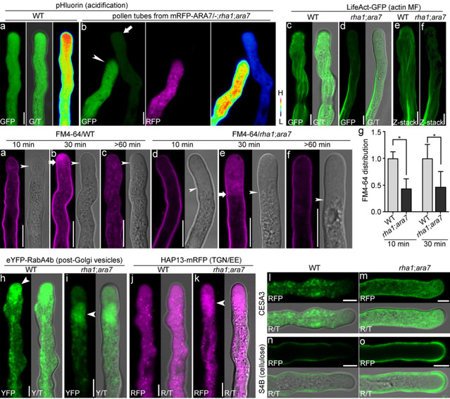 作者通过GUS和Aniline blue标记以及花粉管半体内(Semi-in-vivo)生长实验,发现rha1;ara7双突花粉管无法正常穿过花柱;进一步研究发现Rab5介导的液泡运输途径被阻断,导致液泡体积明显减小,形态异常;液泡是质子储存的关键细胞器,通过pHLuorin标记胞质酸碱度,发现rha1;ara7花粉管具有更低的pH;胞质的pH稳态丧失导致花粉管顶端微丝紊乱且数量较少,外泌囊泡在花粉管亚顶端聚集,无法迅速与顶端质膜融合;FM4-64标记的内吞速率也明显降低,表明质膜上的膜动态异常。由Rab5基因突变引发以上多种胞内活动的缺陷,从而阻碍了花粉管穿过花柱的生长过程。