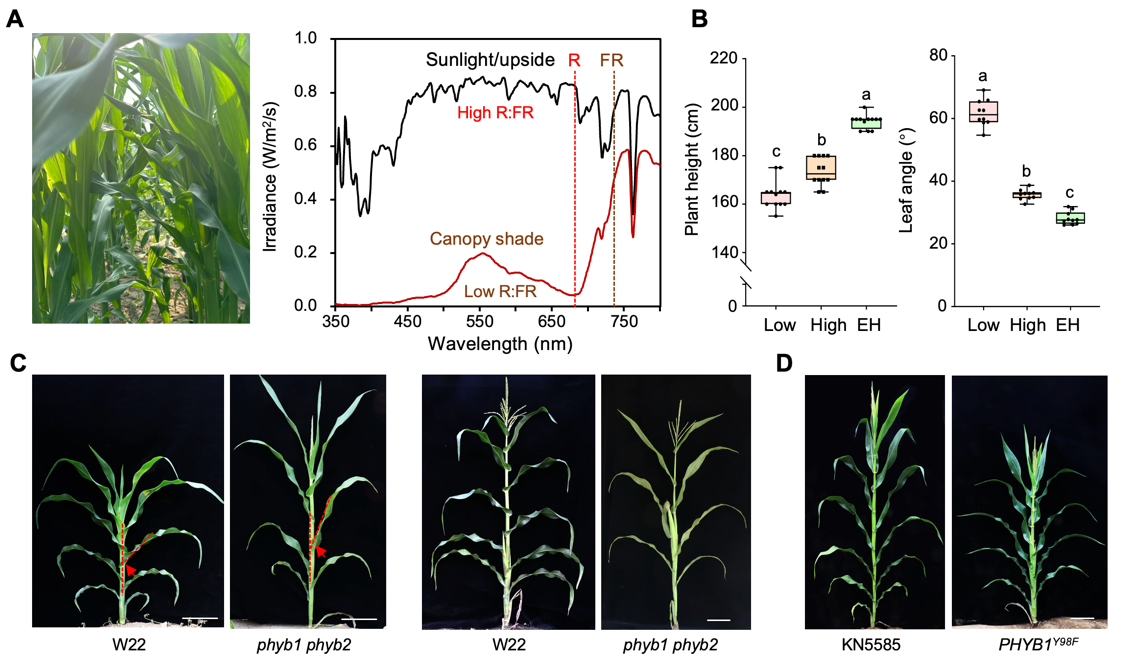 图1. 光受体phyB是玉米株型建成和避荫反应的关键调控因子