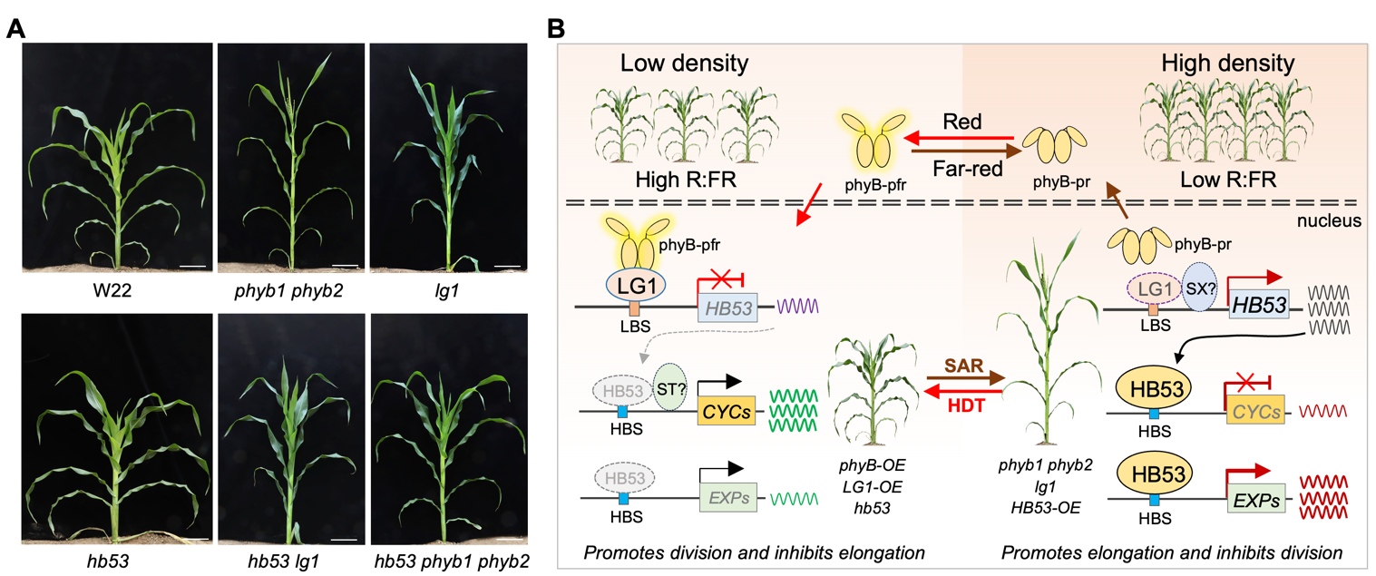 玉米是全球种植面积最广和总产量最高的农作物。近几十年来,玉米产量持续提升的关键因素之一是种植密度的不断增加。目前,黄淮海地区玉米的种植密度在4000-4500株/亩左右,远低于美国玉米主产区6000株/亩以上的生产密度。然而,过度地增加玉米种植密度会诱发避荫反应,导致株高增加、叶夹角变小、茎秆纤细、易倒伏和空杆,最终导致减产。因此,解析玉米避荫反应的分子调控机制,发掘和利用耐密高产基因,是提高我国玉米单产水平的有效途径之一。