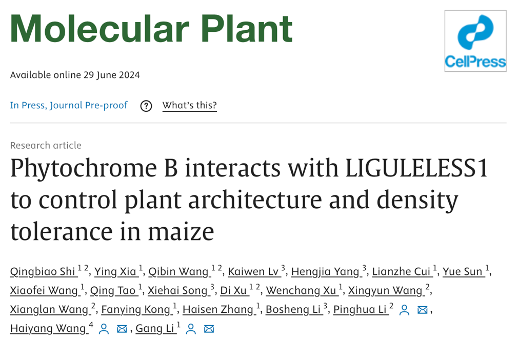 2024年6月29日,国际著名期刊Molecular Plant杂志在线发表了由山东农业大学李刚团队和华南农业大学王海洋团队的合作研究论文"Phytochrome B interacts with LIGULELESS1 to control plant architecture and density tolerance in maize"。该研究首次揭示了玉米光受体phyB感受不同密度下环境光信号的动态变化,通过与转录因子LG1的直接互作,调控不同密度和环境光信号下LG1的蛋白水平及其下游基因HB53的表达水平,从而实现对玉米株高和茎叶夹角建成的精准调控,为玉米株型建成调控和耐密性提高提供了理论基础和重要基因资源。