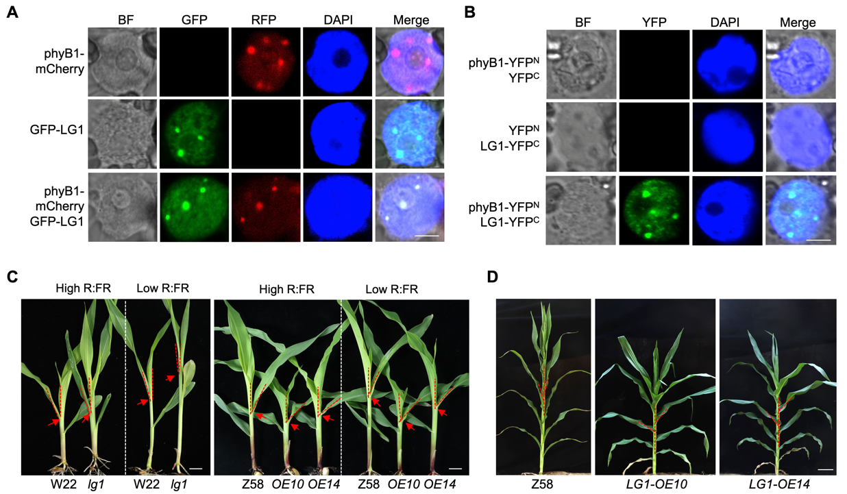 能与LG1互作,进而导致LG1蛋白含量快速降低,最终形成株高增加和叶夹角变小的表型。这些证据综合表明,光受体phyB通过感受环境光信号,在高红光下促进LG1稳定,在高远红光下促进LG1的快速降解,进而实现不同种植密度或冠层结构下对株高和叶夹角的精准调控。