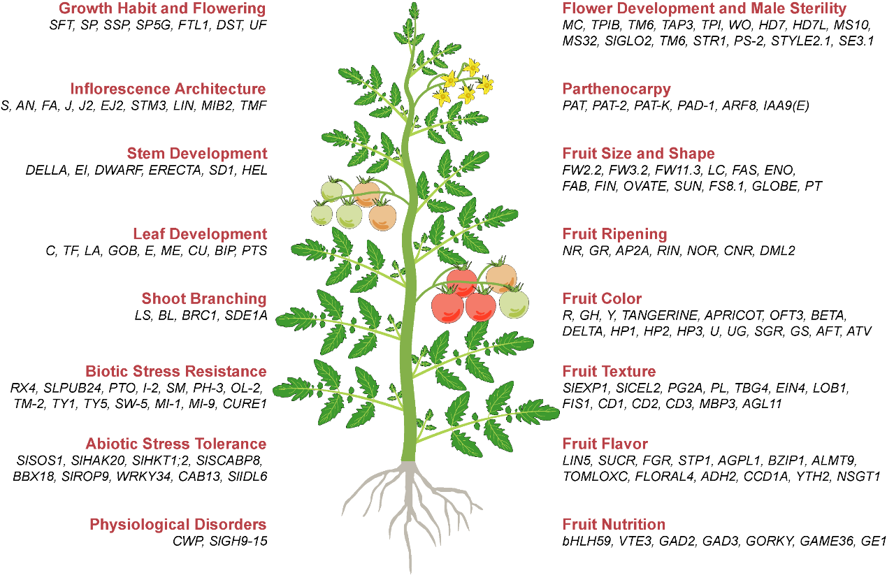 人们对番茄重要农艺性状形成机理的理解深度决定了未来番茄育种的精准度和效率。迄今为止,科学家已经在番茄中鉴定上千个数量性状位点(QTLs),并且已经挖掘了数百个对番茄农艺性状至关重要的基因。该文从番茄的株型、花器官发育、果实性状和抗性性状四方面系统总结了番茄重要农艺性状形成机理的研究进展(图2),可为从事番茄基础生物学研究和遗传育种研究的同行提供重要的借鉴和参考。