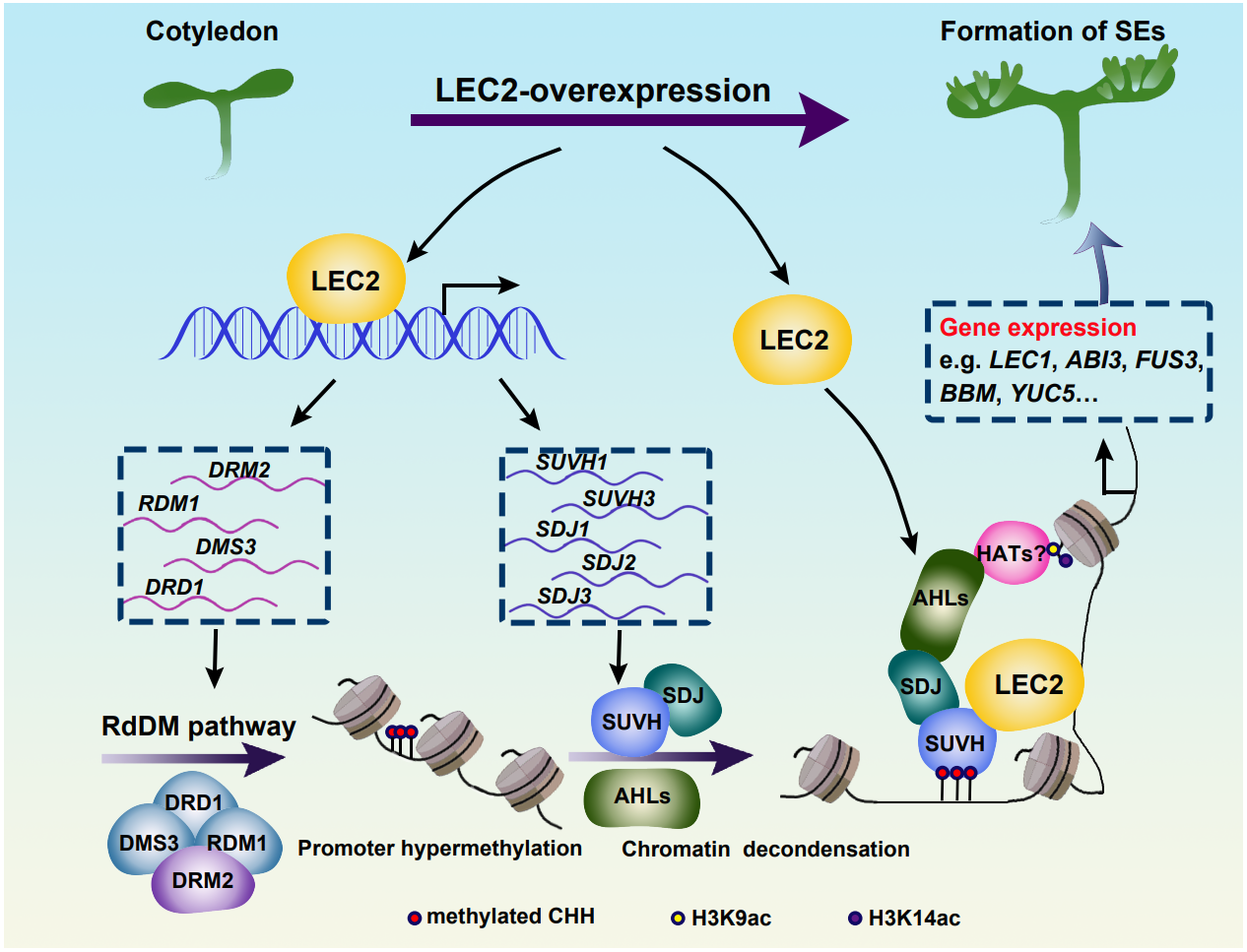 团队研究发现,在LEC2诱导的体细胞胚胎发生过程中,LEC2通过RNA介导的DNA甲基化(RdDM)途径在DNA上打满CHH型甲基化标记,DNA甲基化识别复合物SUVH-SDJ识别标记,并招募AHL染色质修饰蛋白,增加染色质开放程度,让基因开关得以暴露。同时,识别复合物与LEC2相互作用,形成正反馈调控通路,进一步激活全能性调控基因,促进体细胞胚胎的形成。